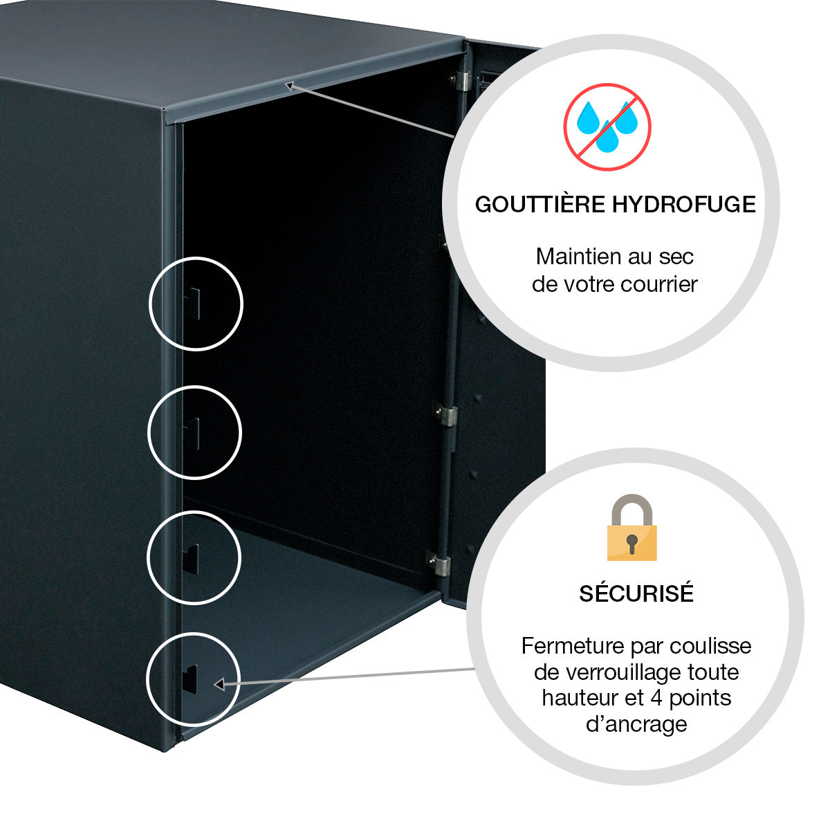 Le système de fermeture, doté d'une coulisse de verrouillage toute hauteur avec 4 points d'ancrage, résiste à une force d'arrachement de 120 kg, garantissant une protection pour vos colis. De plus, l'installation est simple et rapide. Atout peut être complété par un pied latéral, pour une pose sur pied.