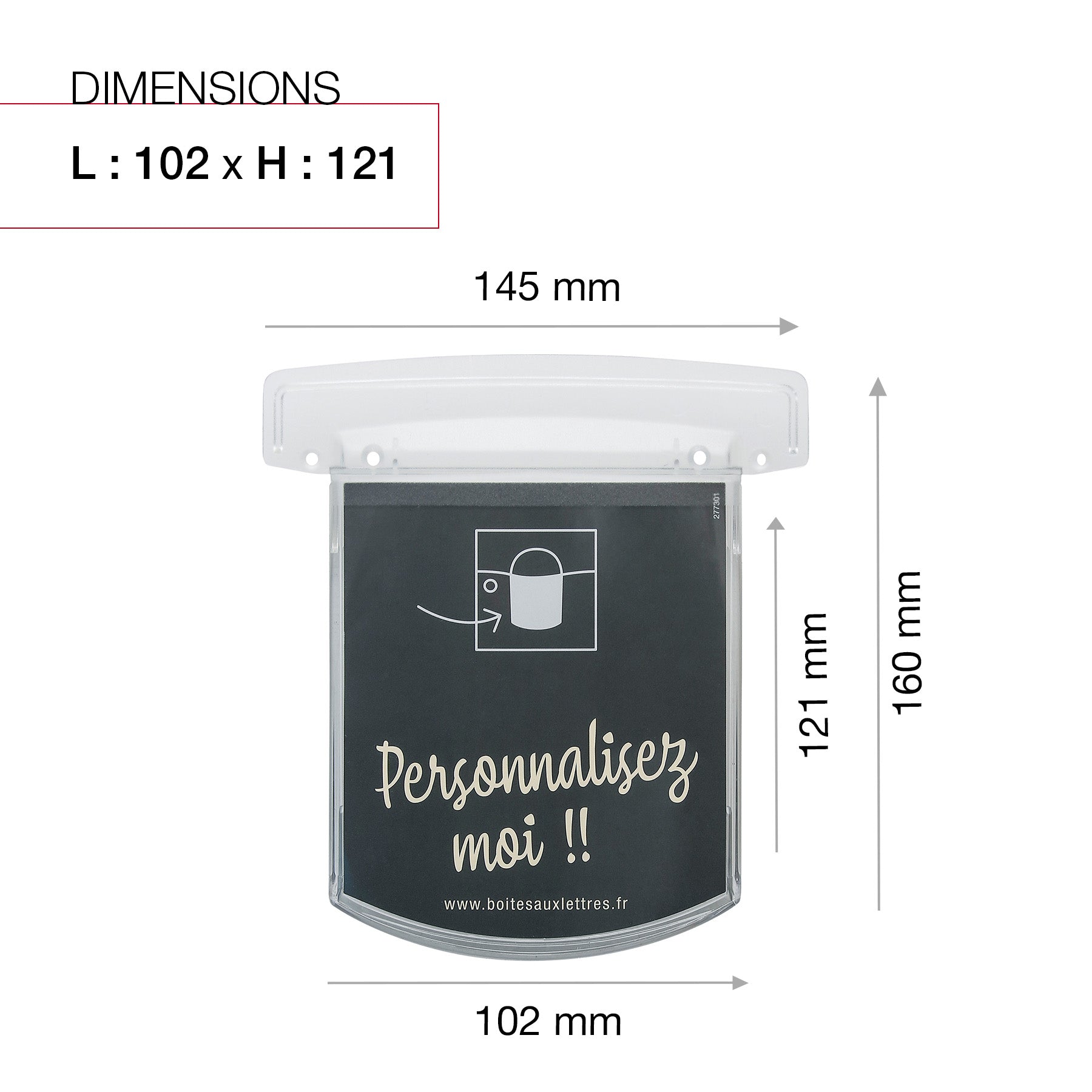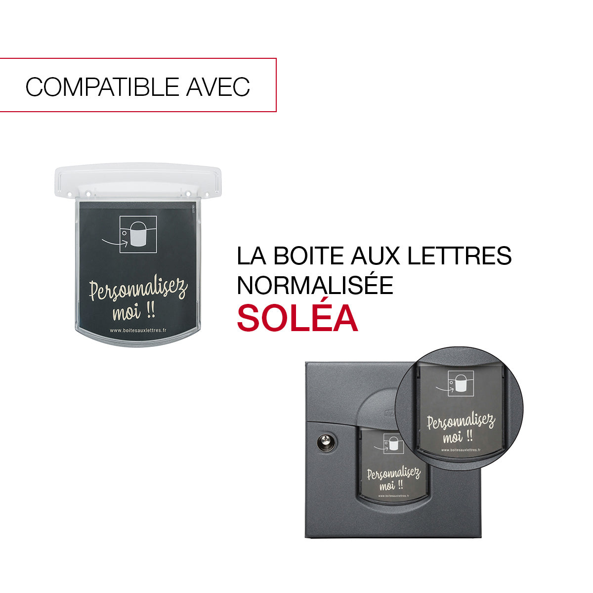 Le porte-nom Soléa est uniquement compatible avec le modèle de boite aux lettres Soléa (1 porte ou 2 portes). À encliqueter, le porte-nom est résistant aux rayons UV. Vous avez également la possibilité de personnaliser votre étiquette, directement sur notre site. Choisissez vos couleurs, vos informations et même des photos pour concevoir une étiquette à votre image ! Inclus : contre-plaque et étiquette réversible, "Publicité, non merci".