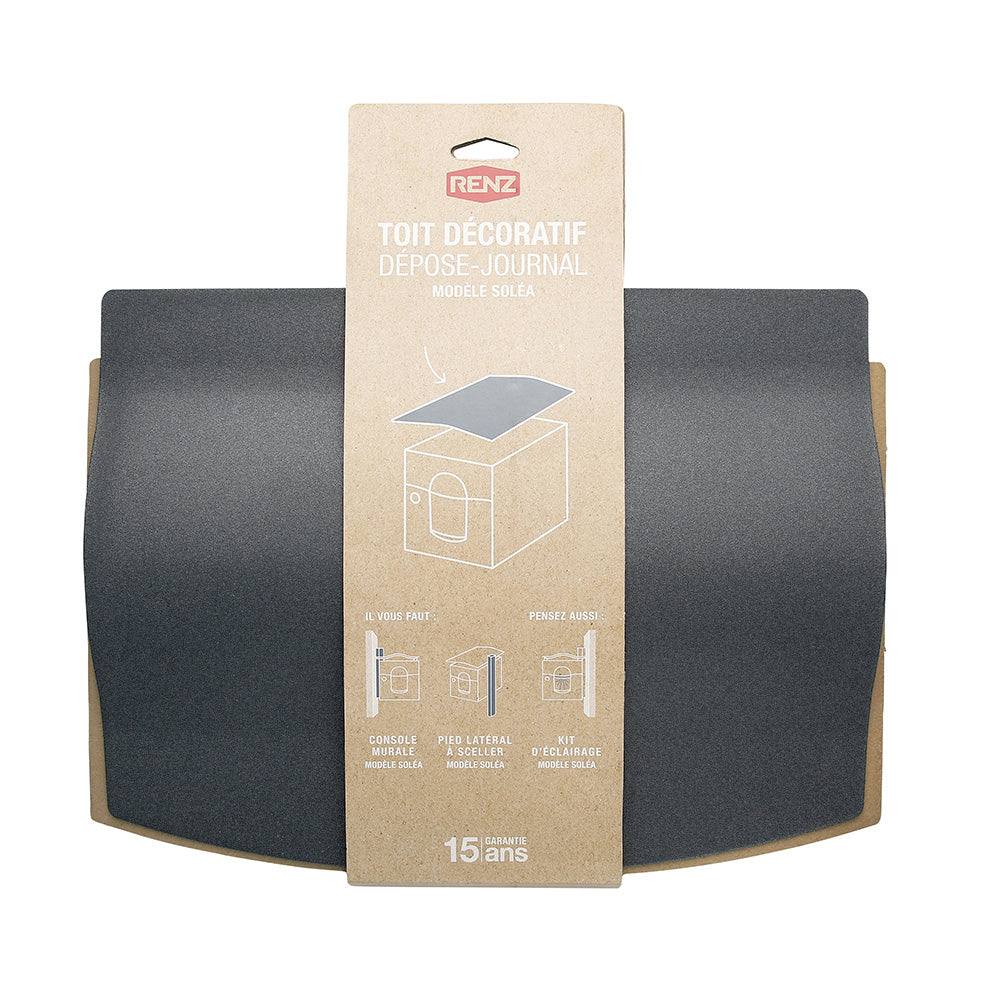 Toit décoratif dépose journal Renz en acier. Permet de glisser le journal entre la boite et le toit. Offre esthétisme et fonctionnalité. Possibilité de montage droit ou gauche sur le pied latéral ou console murale. Pose facile. Peinture poudre polyester sans plomb. Garantie anti-corrosion de 15 ans par perforation intérieure. Dimensions 320 x 425 x 50 mm.